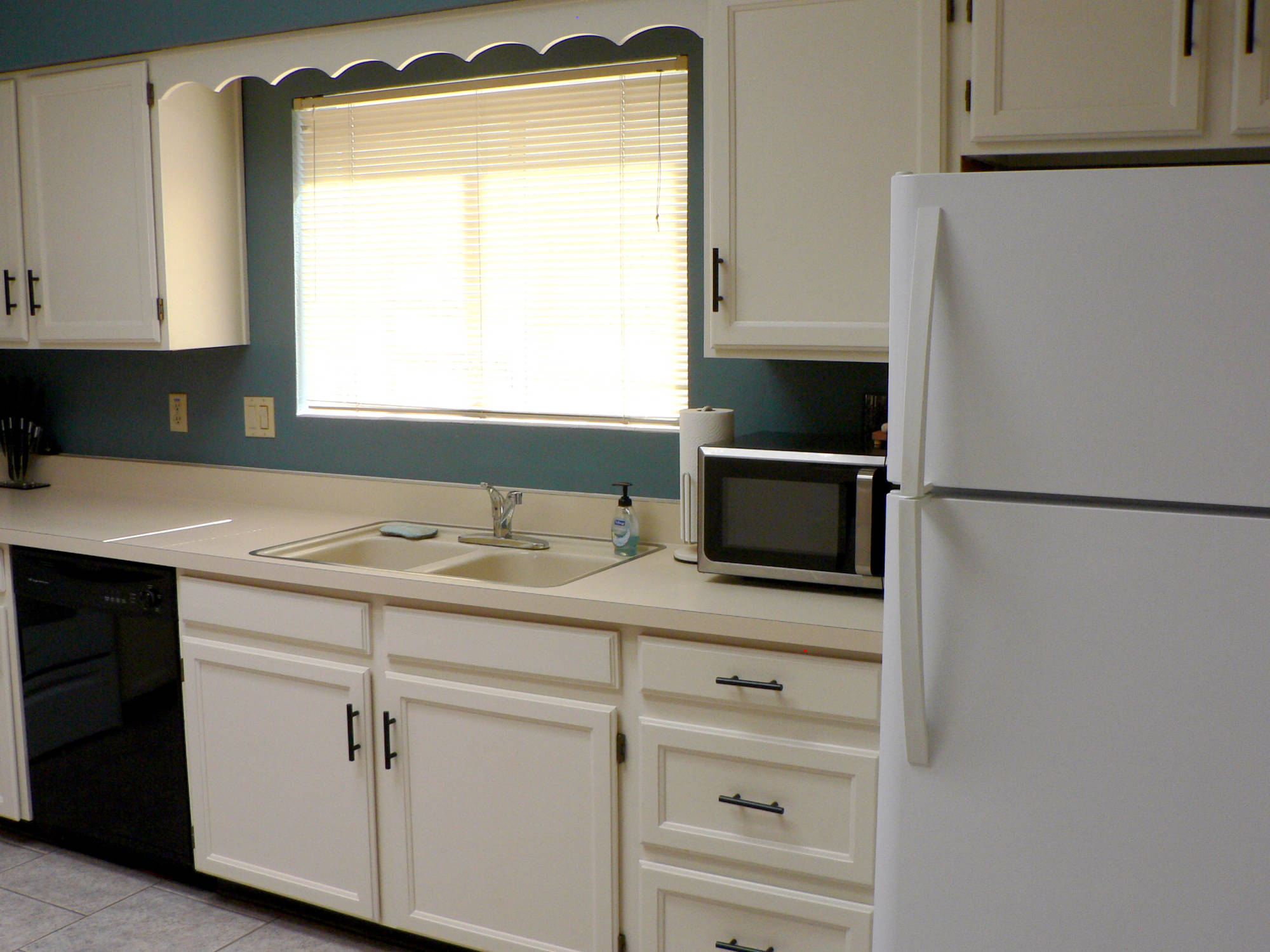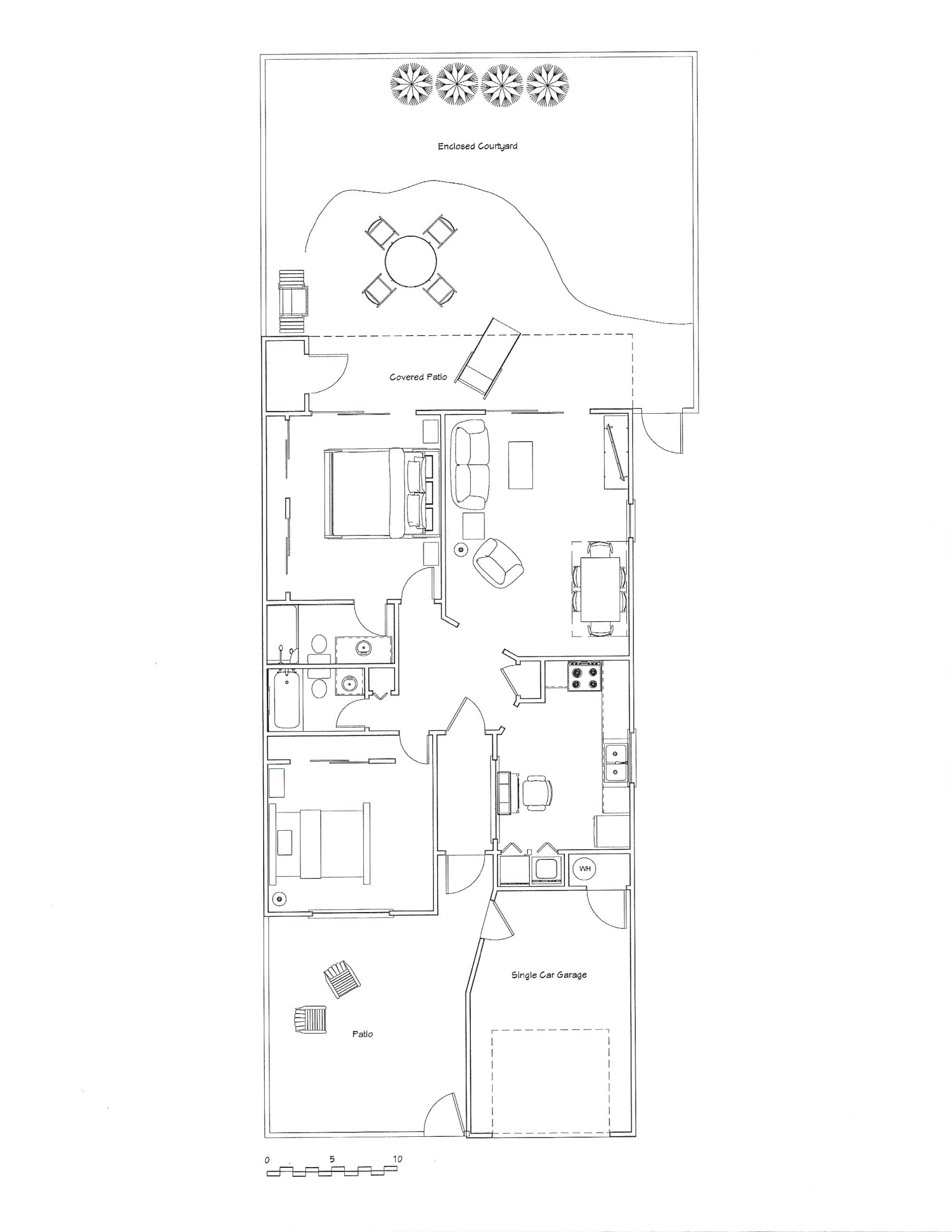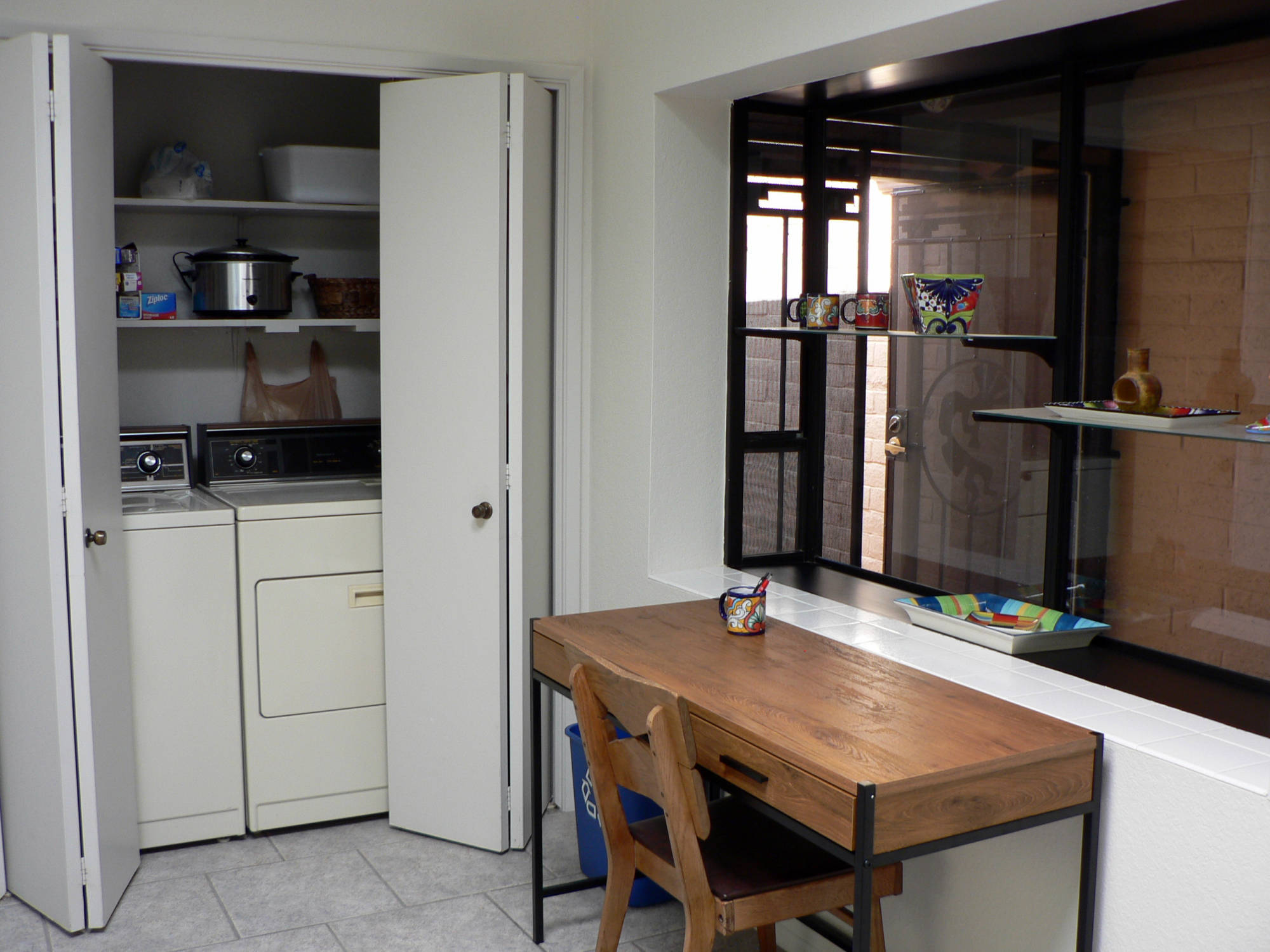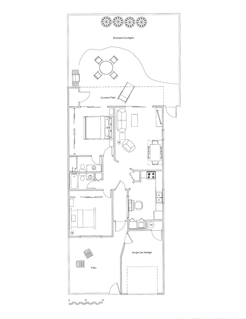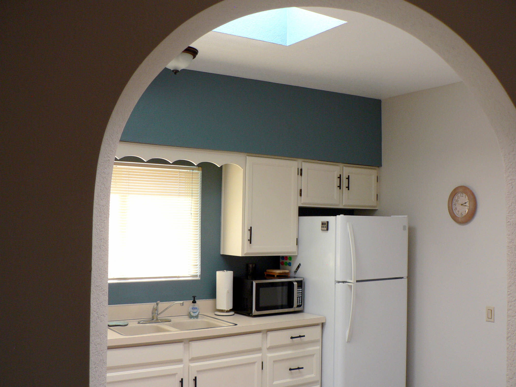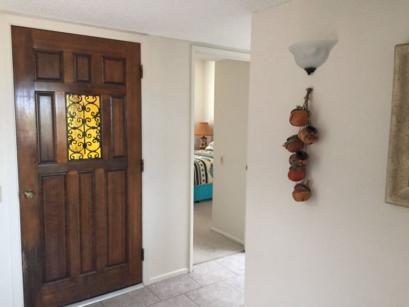 From the front courtyard enter the enclosed foyer and step inside to a home filled with natural light. The large kitchen has two skylights and a window above the sink along with a laundry closet with a full size washer and dryer. There is a refrigerator, dishwasher, stove/oven and microwave. Appliances include a blender, hand mixer, toaster, coffee maker and more. Basically, everything you will need for your stay.