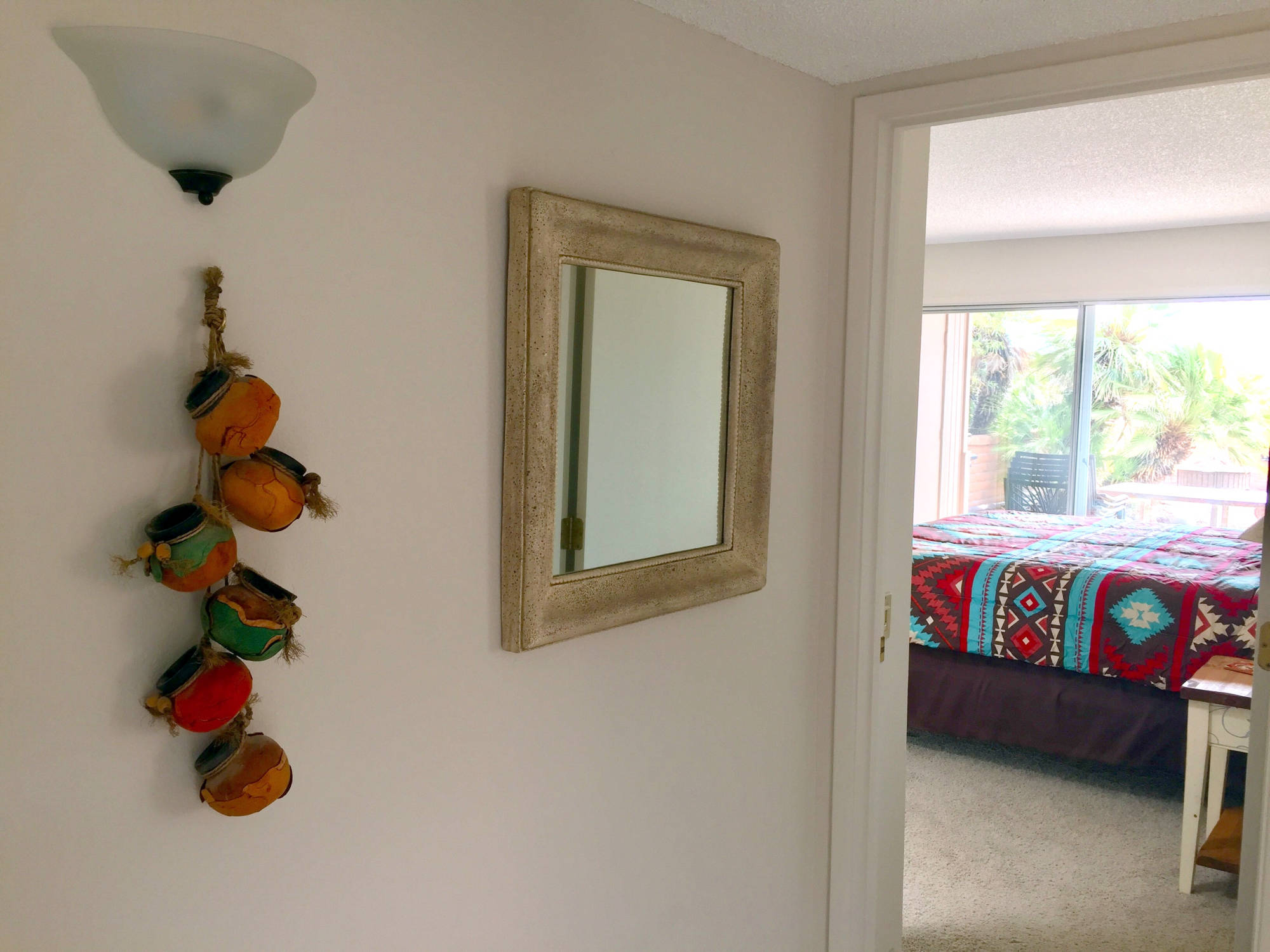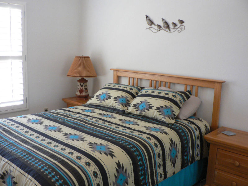 The master bedroom has a king size bed, two large closets and a sliding door to the private court yard and covered patio surrounded with desert landscaping.